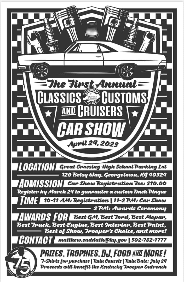 The next event on this list is the First Annual Classics Customs and Cruisers Car Show, put on by the Kentucky State Police at Great Crossing High School on April 29, 2023. Registration is only $10 from 10 a.m. – 11 a.m., and the show is from 11 a.m. – 2 p.m. Awards will include: